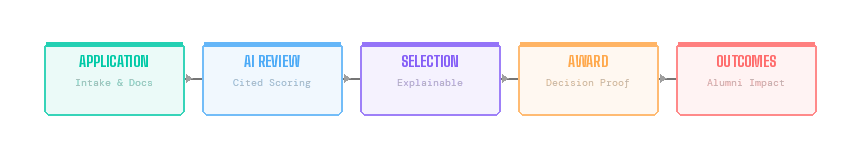 It instantly shows the reader the full journey: APPLICATION → AI REVIEW → SELECTION → AWARD → OUTCOMES, all connected by one unique ID. This is the "what we do differently" visual.