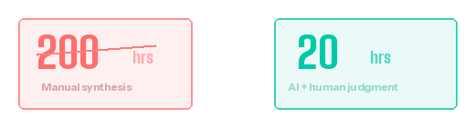 200 hours of manual synthesis compressed into 20 hours of decision-making. Not by cutting corners — by routing the right work to the right layer. AI handles extraction and scoring. Humans handle edge cases and calibration. Every decision ships with sentence-level proof that survives board scrutiny.