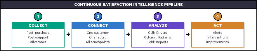 Link satisfaction data to behavioral metrics — retention, expansion, referrals — through shared customer IDs. Validate which satisfaction drivers actually predict the outcomes you care about. This step transforms satisfaction measurement from opinion tracking to predictive intelligence.