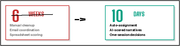 📌 Embed submission-time-compression.png here — the struck-through 6 WEEKS (manual cleanup, email coordination, spreadsheet scoring) → 10 DAYS (auto-assignment, AI-scored narratives, one-session decisions). Place centered, inline. Maximum visual impact for the core ROI claim.