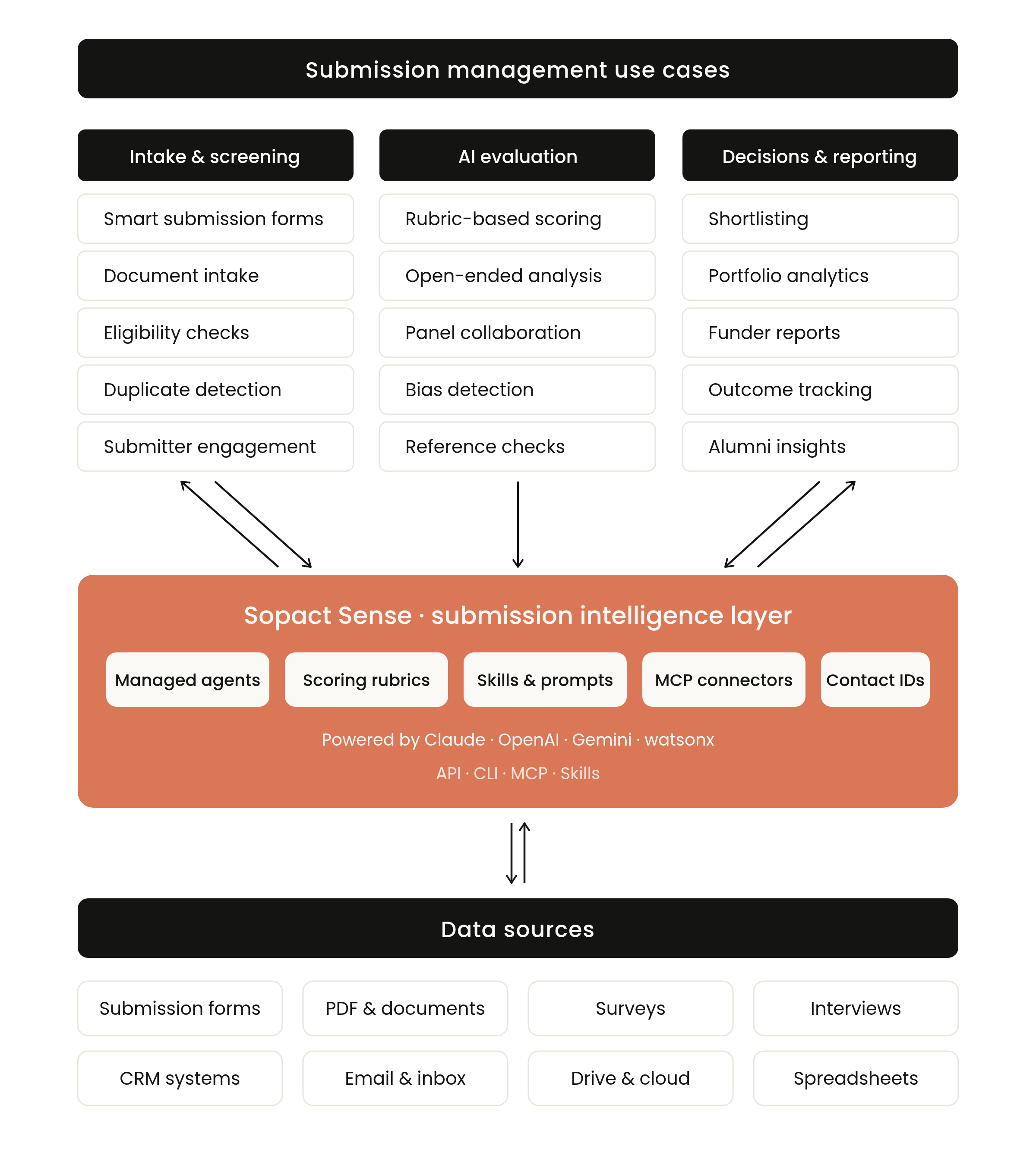 Sopact Sense is built as an origin system for submission management. Every submission is collected inside Sopact Sense — not imported from another platform — which means every submitted document is read by AI at the moment of intake. The Decision Lag closes because evaluation no longer waits for human reading. It happens at submission.